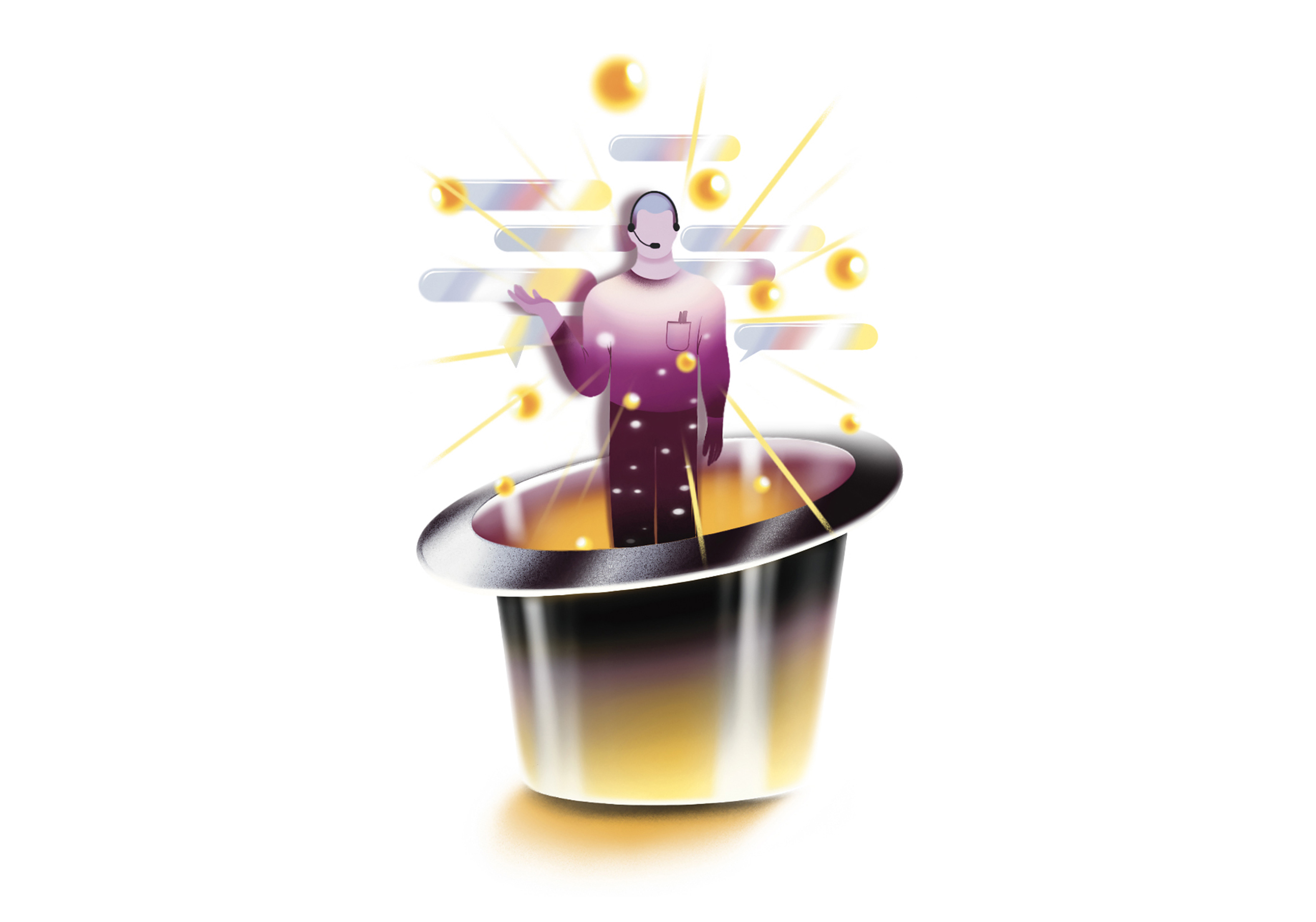 A series of illustrations about automation that behind the scenes does magic tricks, helping customers and businesses with their experience.